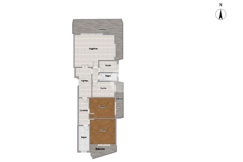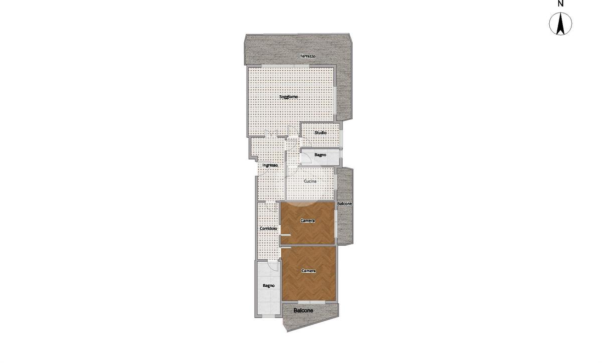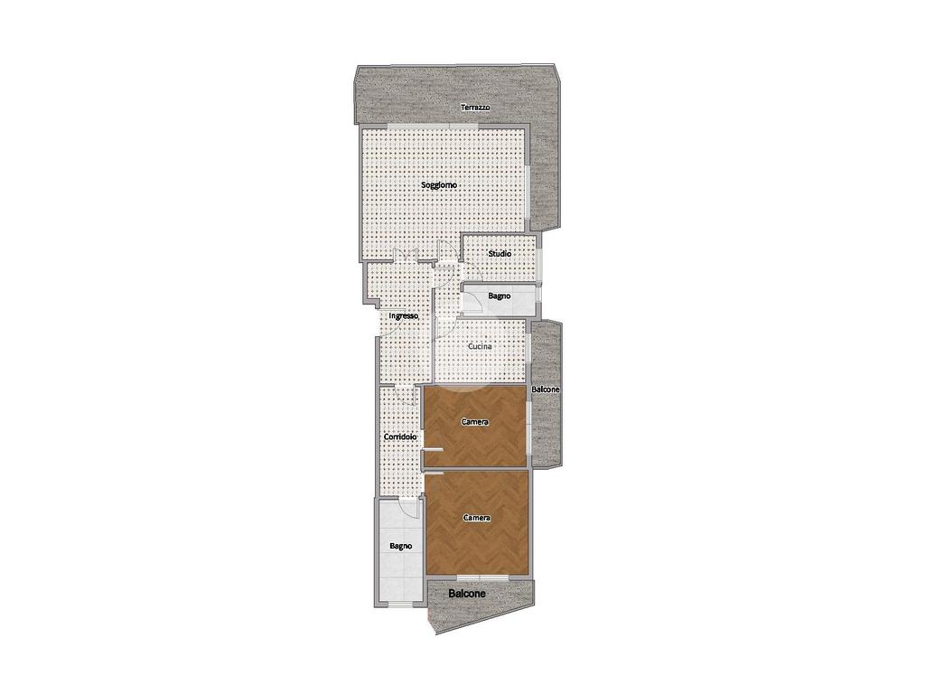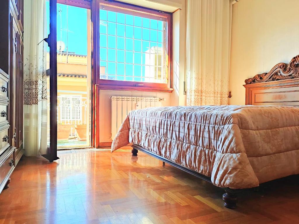 Proseguendo, un lungo corridoio dotato di comodo armadio a muro ci conduce alla zona notte della casa composta da due camere da letto matrimoniali e un ulteriore servizio completo di finestra e vasca. Entrambe le camere godono di accesso esterno su due balconi.